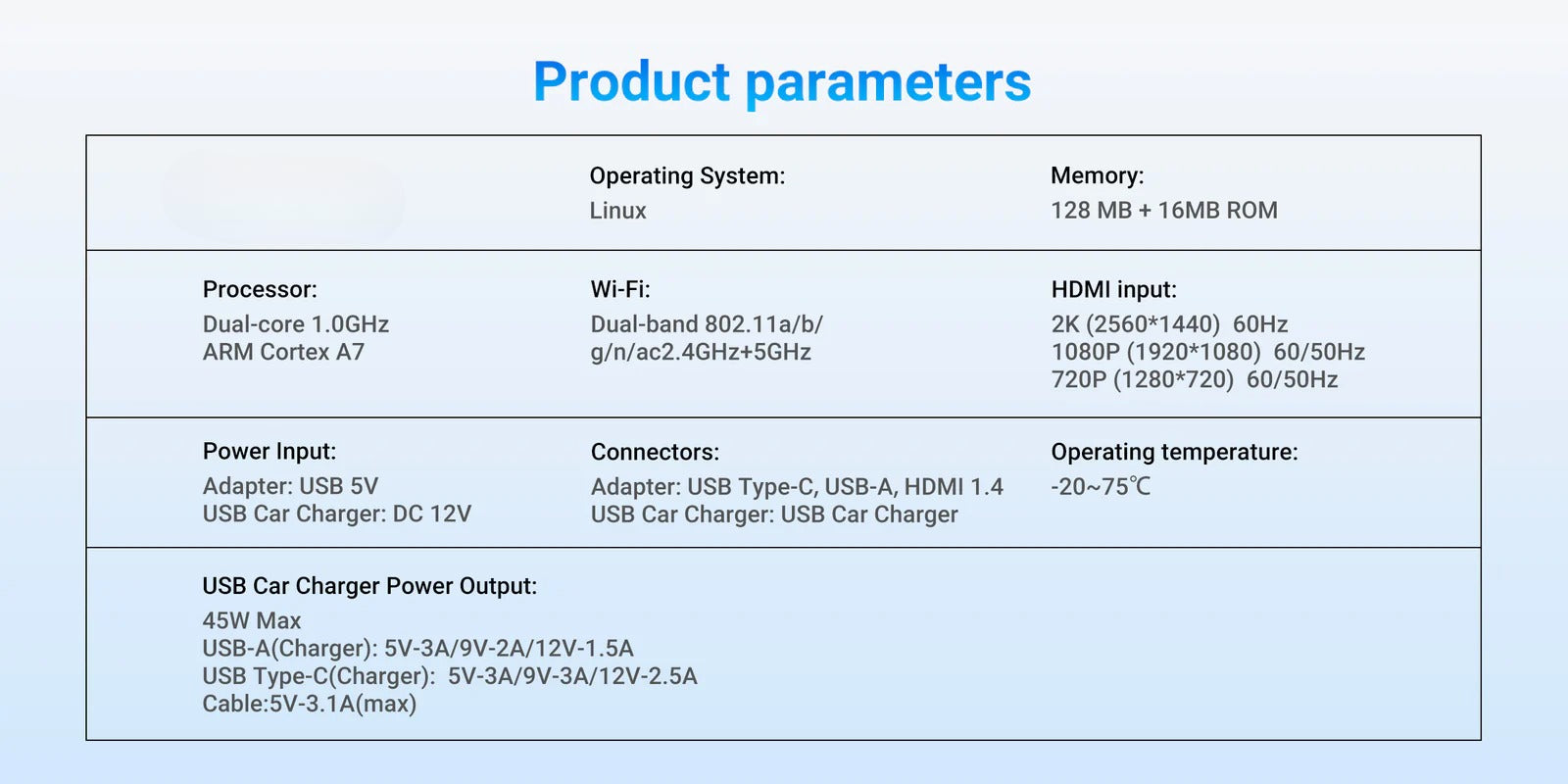 Power Input: Adapter USB 5V and USB Car Charger DC 12V, offering flexible power options for different environments.