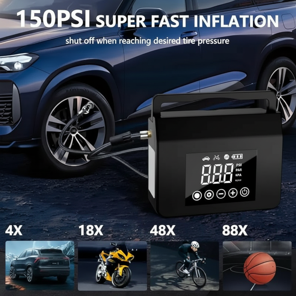 This function supports car tires, bicycle tires, athletic equipment, and small inflatables. The interface is user-friendly and operates using preset levels.