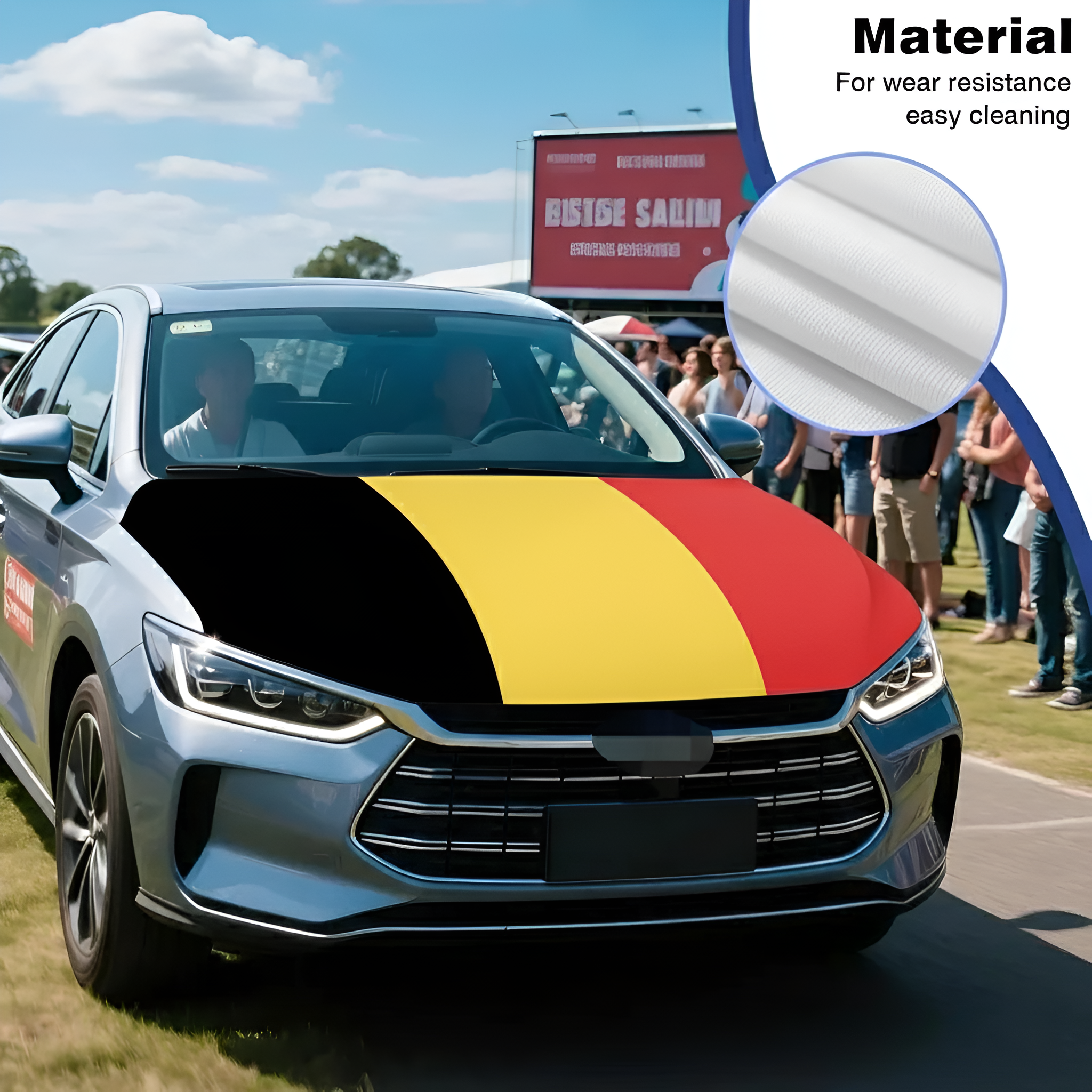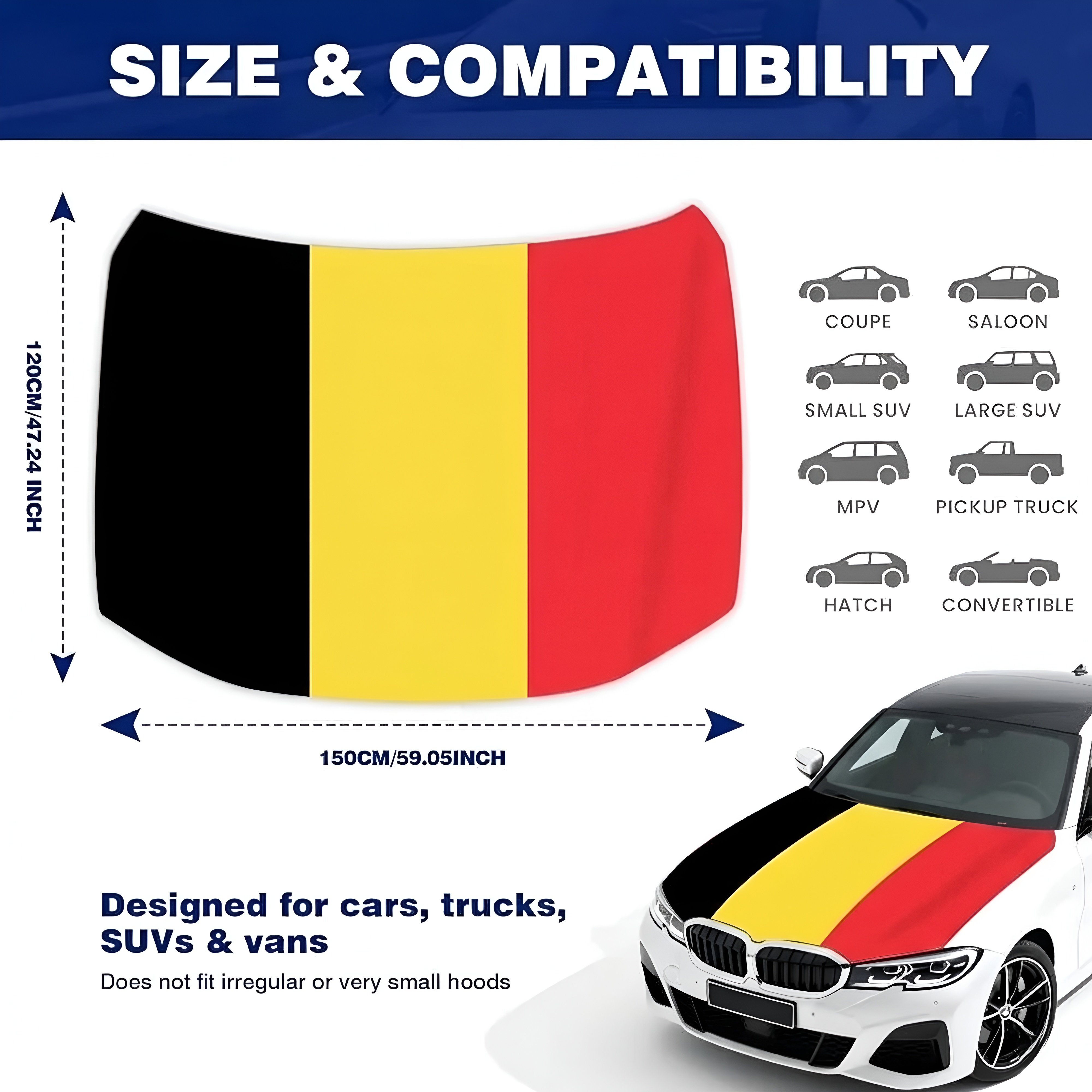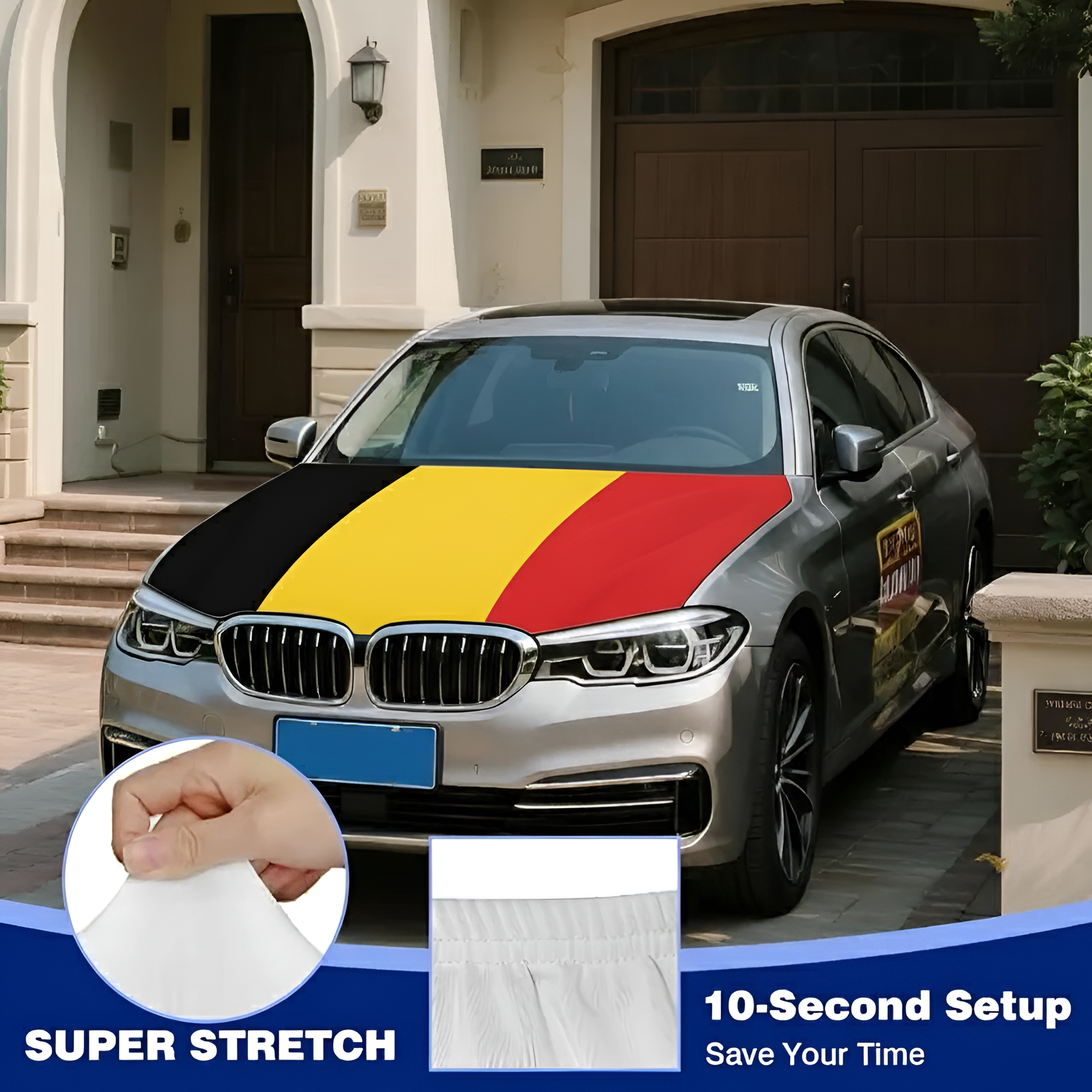 This Official FIFA 2026 Belgium Flag Car Hood Cover is prepared to display the national flag design across the hood area while providing surface coverage during everyday driving. Measuring approximately 4 x 5 feet, the size supports compatibility with many cars, trucks, and SUVs. The cover is made from stretch polyester fabric that adapts to the hood shape and helps maintain a smooth appearance during regular vehicle use. The printed black, yellow, and red design remains clearly visible across the fabric surface. The flexible material allows quick placement and removal while maintaining a stable position during normal driving conditions.