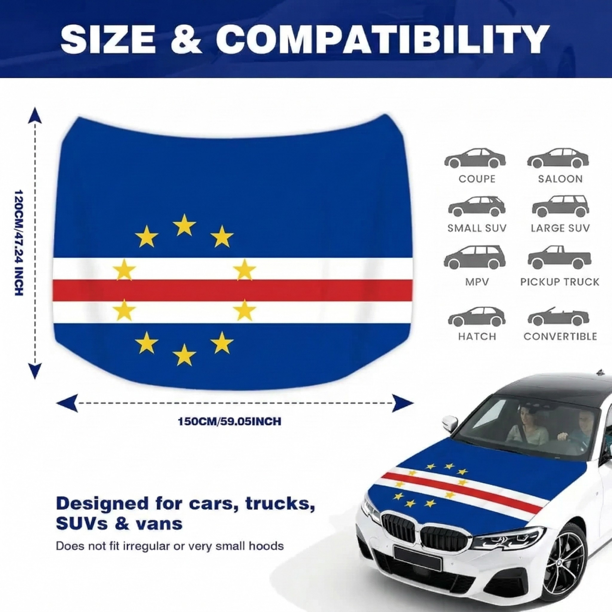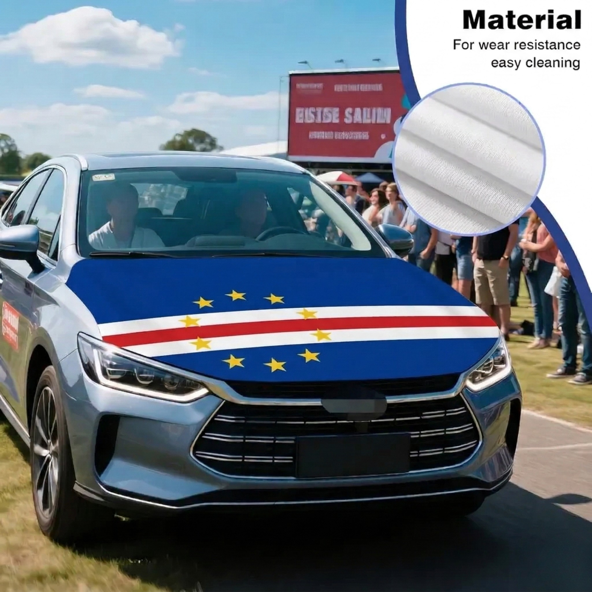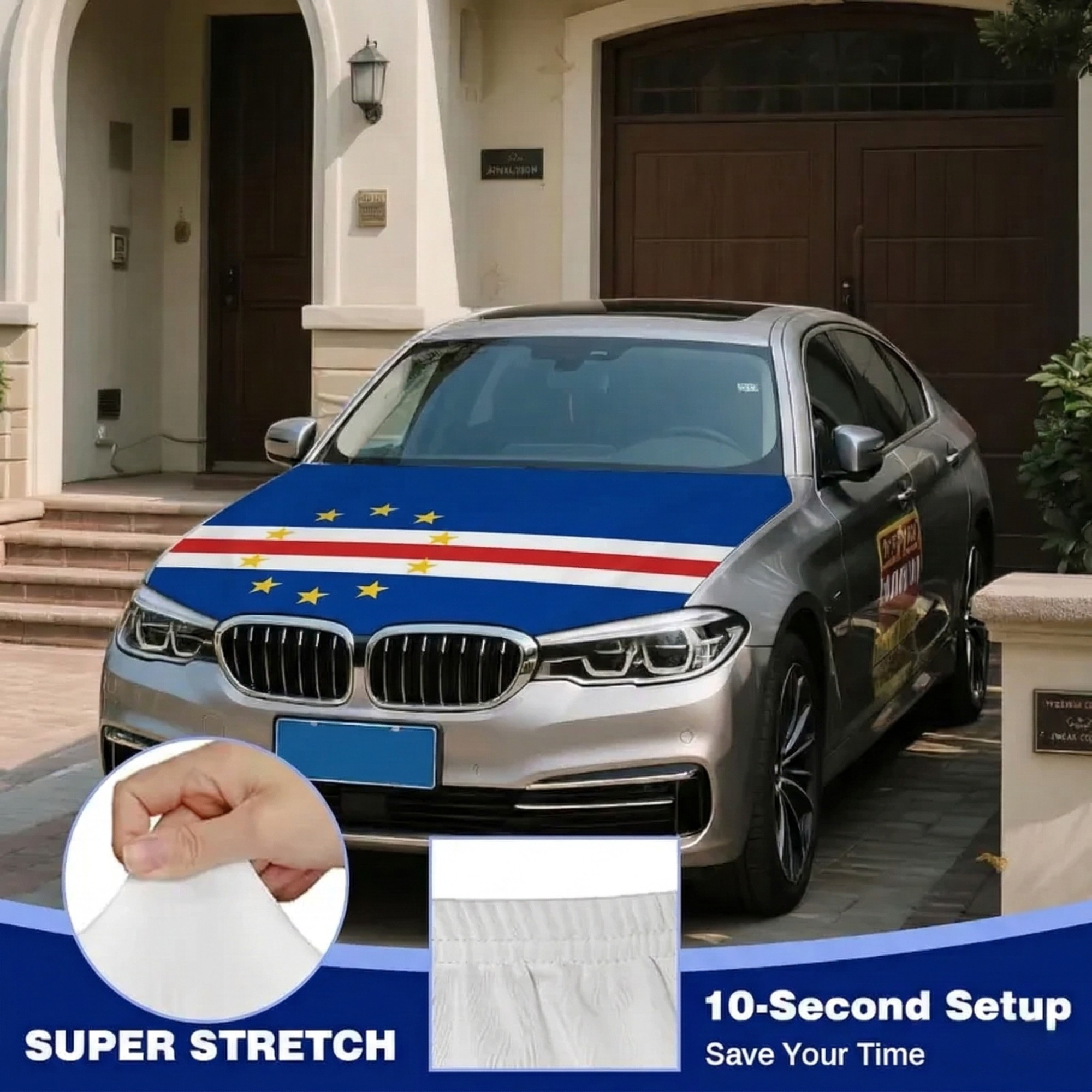 This Official FIFA 2026 Cape Verde Flag Car Hood Cover is designed to display the national flag design across the vehicle hood while covering the surface during regular driving. Measuring approximately 4 × 5 feet, the cover provides a universal fit suitable for many cars, trucks, and SUVs. Made from stretch polyester fabric, the material adapts to the hood shape and helps maintain a smooth appearance during vehicle use. The printed design features the blue field with horizontal stripes and yellow stars associated with the Cape Verde national flag. The flexible structure allows quick placement and removal while maintaining a stable position during normal driving conditions.