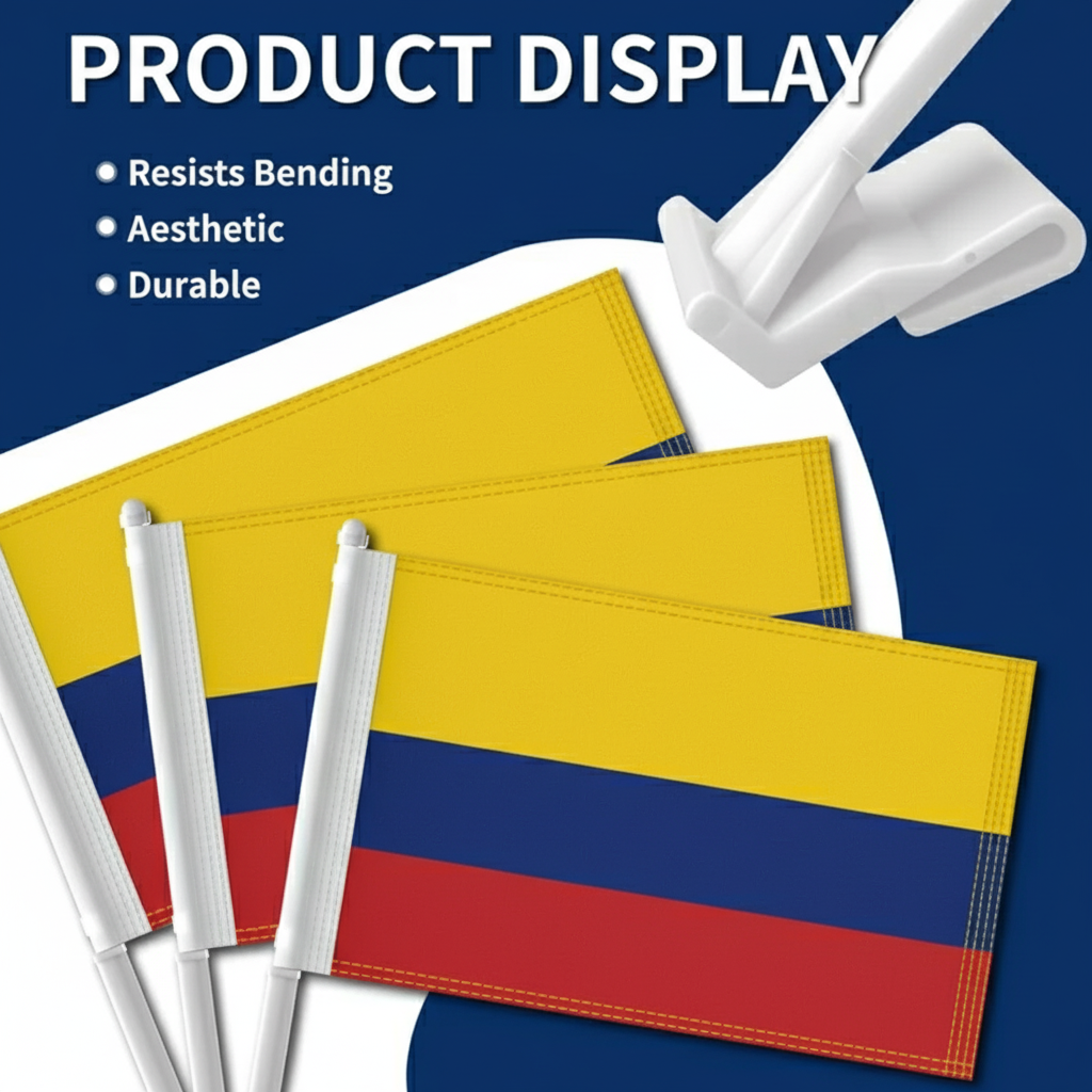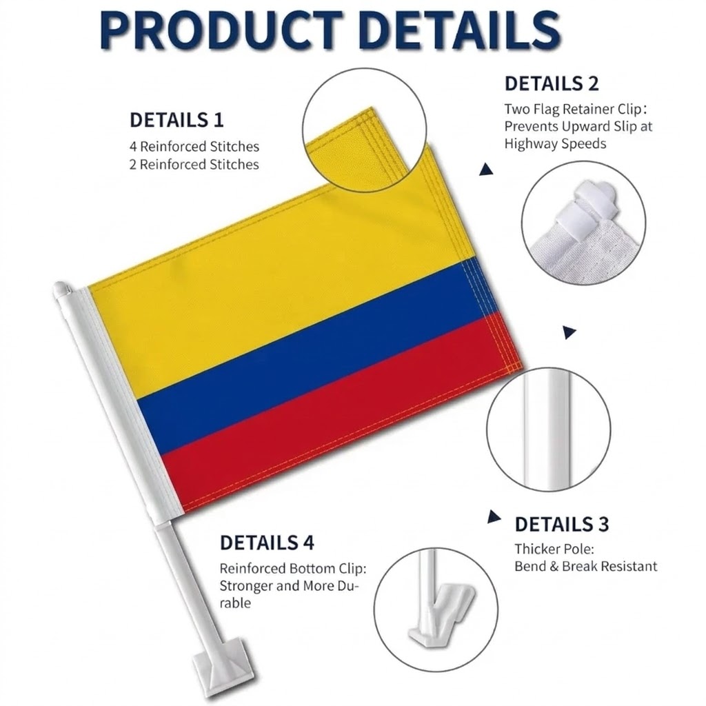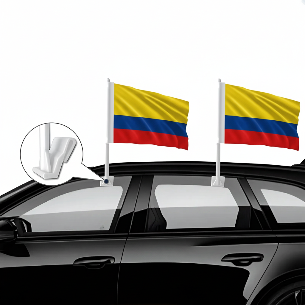 This set of two Official FIFA 2026 Colombia Car Flags, each measuring 11 x 17 inches, is designed for expressing national pride while driving during tournaments, parades, sports gatherings, and patriotic celebrations. Manufactured from two layer warp knit polyester fabric, the material offers a stronger structure than many lightweight flag fabrics. The double sided printing allows the yellow, blue, and red tricolor of the Colombia national flag to appear clear and correctly oriented from both viewing directions. Developed specifically for vehicle display, the flag construction performs well in road wind and changing outdoor weather conditions. A reinforced window clip mounting system allows the flags to be attached to vehicle windows quickly without the need for tools. The thicker support pole helps maintain an upright position while driving, supporting a balanced and organized appearance. Suitable for cars, SUVs, and trucks, this flag set offers a convenient display option for tournament celebrations as well as everyday vehicle decoration.