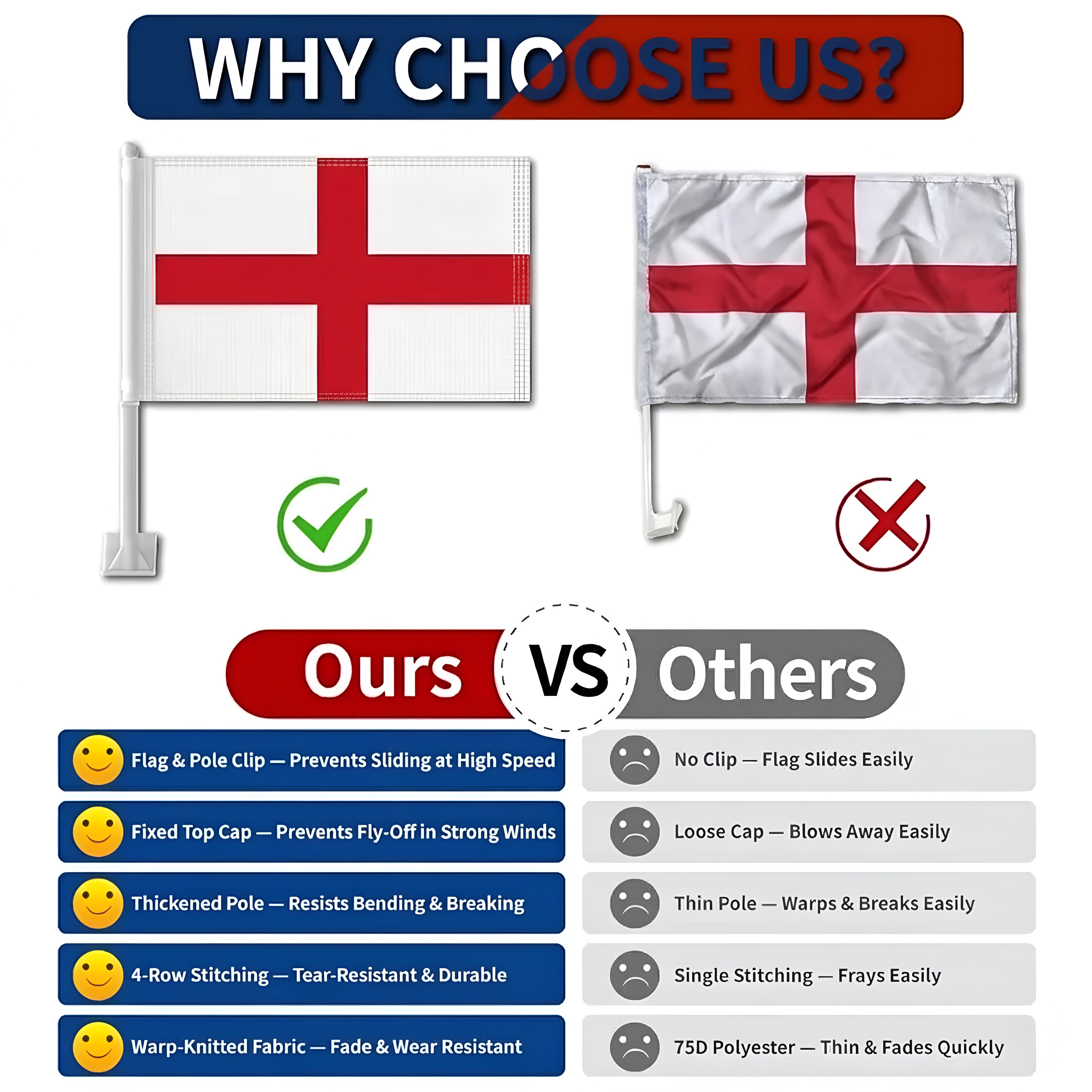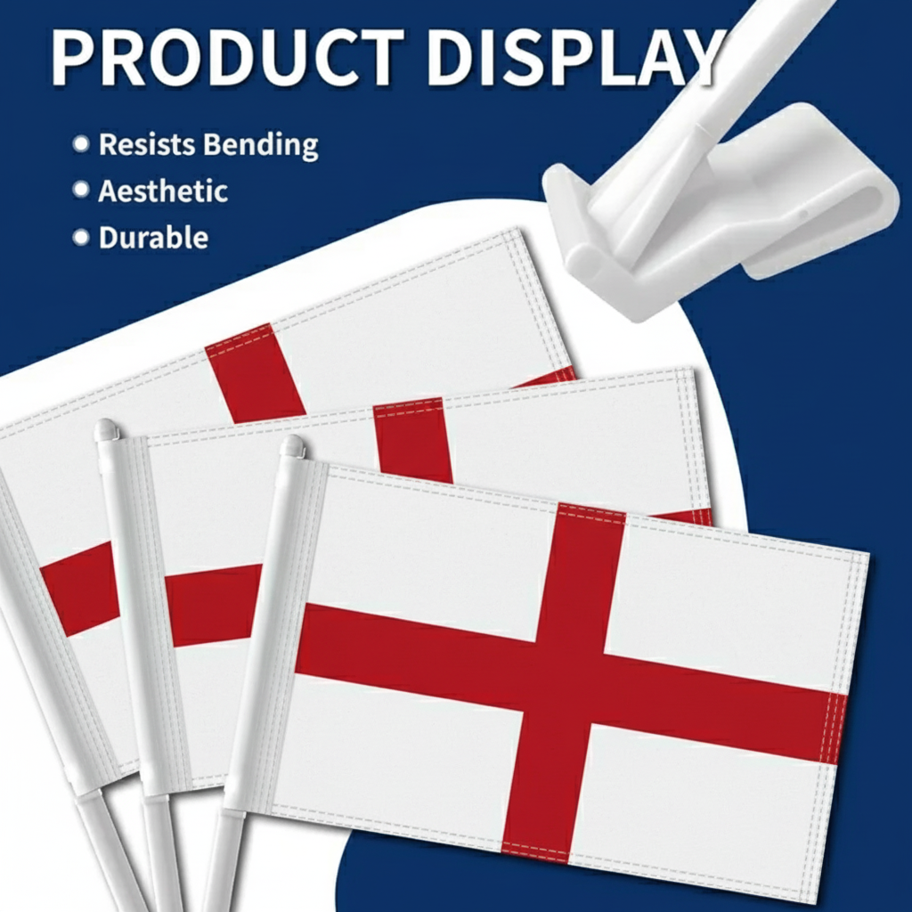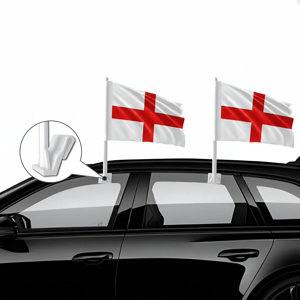 This set of two Official FIFA 2026 England Car Flags, each measuring 11 x 17 inches, is designed for showing national pride while driving during football tournaments, parades, sporting gatherings, and patriotic celebrations. Made from two layer warp knit polyester fabric, the material provides stronger structure compared with many thin flag materials commonly used for vehicle flags. The double sided printing allows the red St George’s Cross of the England flag to appear clear and correctly oriented from both viewing directions. Designed for vehicle display, the flag construction performs effectively in road wind and changing outdoor weather conditions. A reinforced window clip mounting system allows the flags to be attached to vehicle windows quickly without requiring tools. The thicker support pole helps keep the flag positioned upright while driving, supporting a balanced and neat presentation. Suitable for cars, SUVs, and trucks, this flag set provides a practical display option for tournament celebrations as well as everyday vehicle decoration.