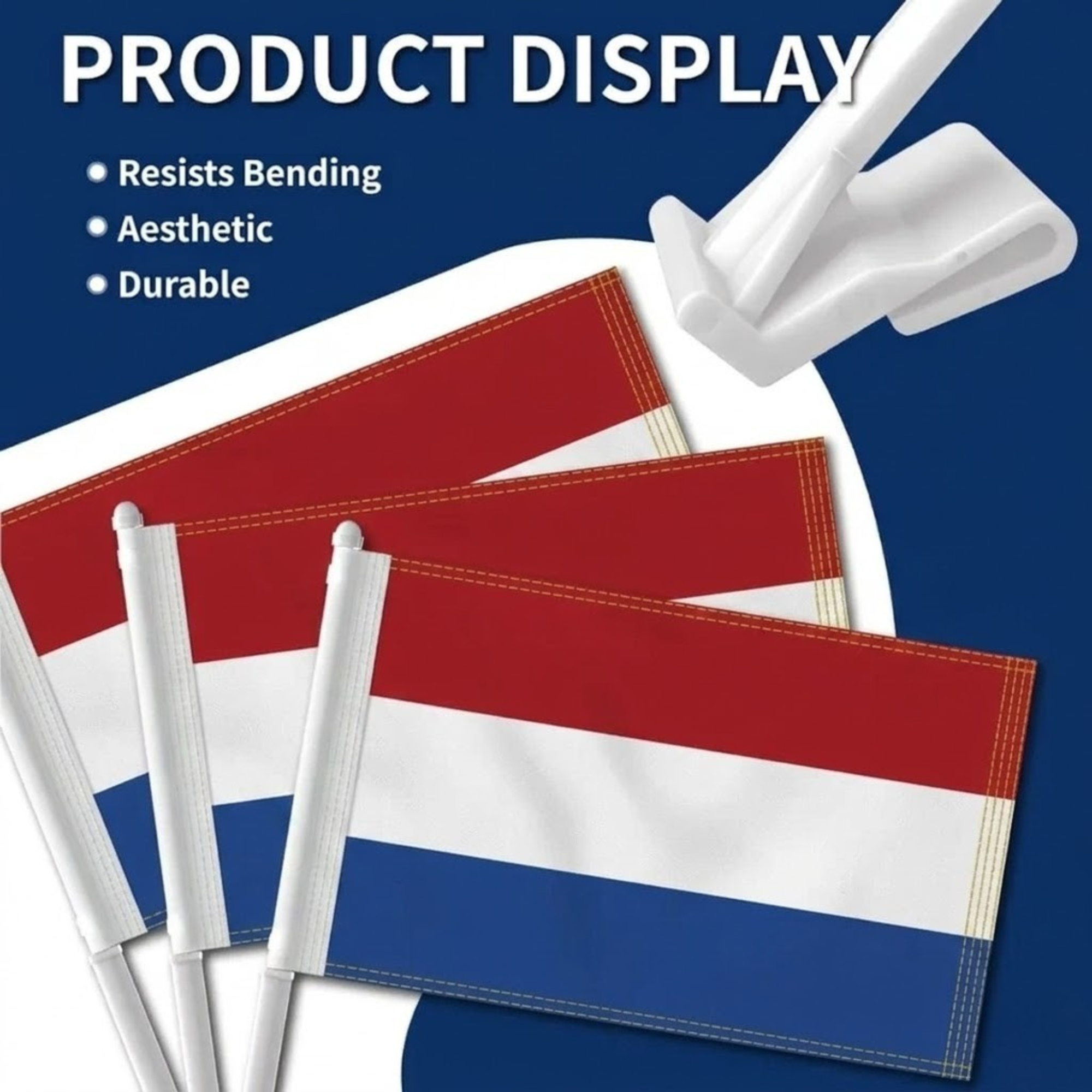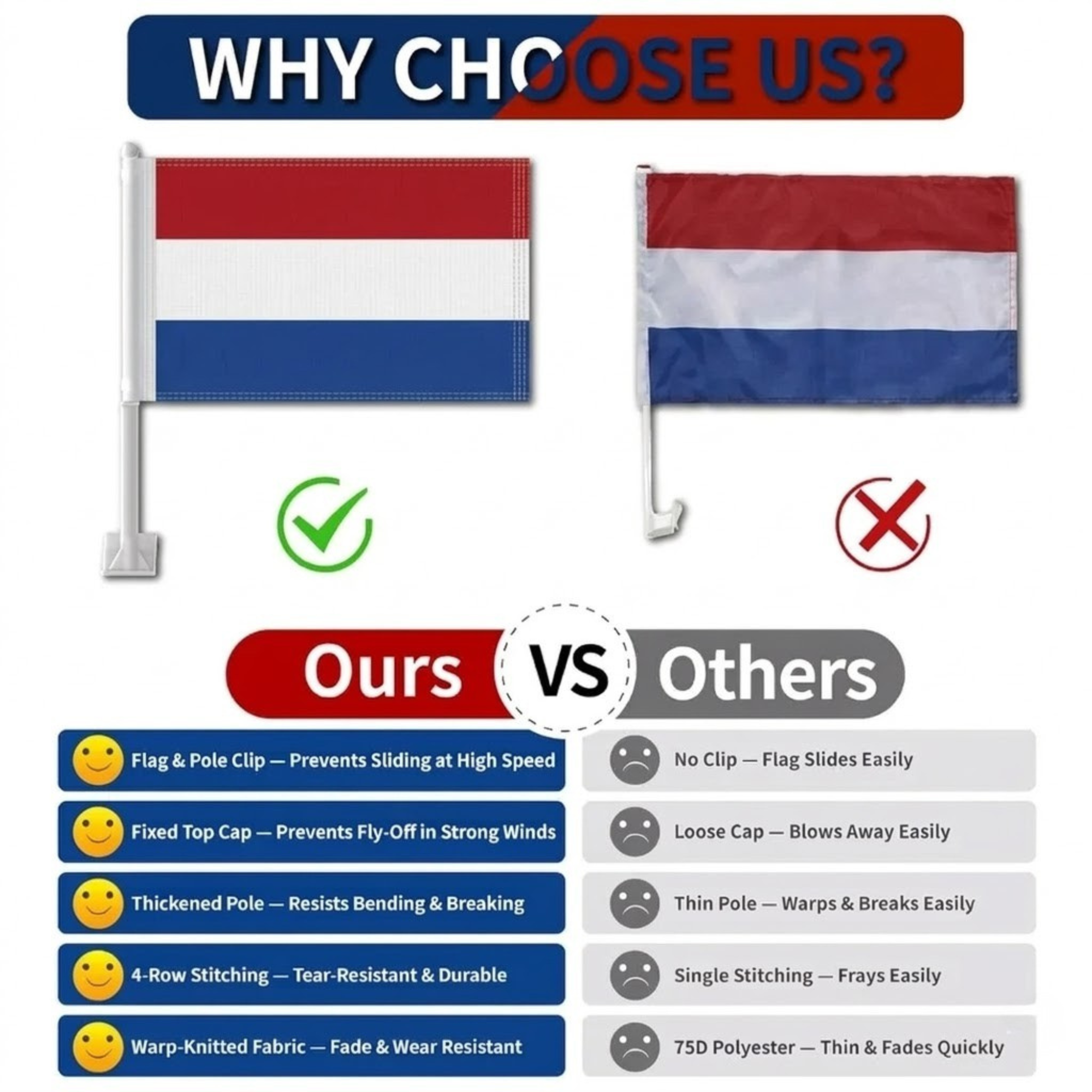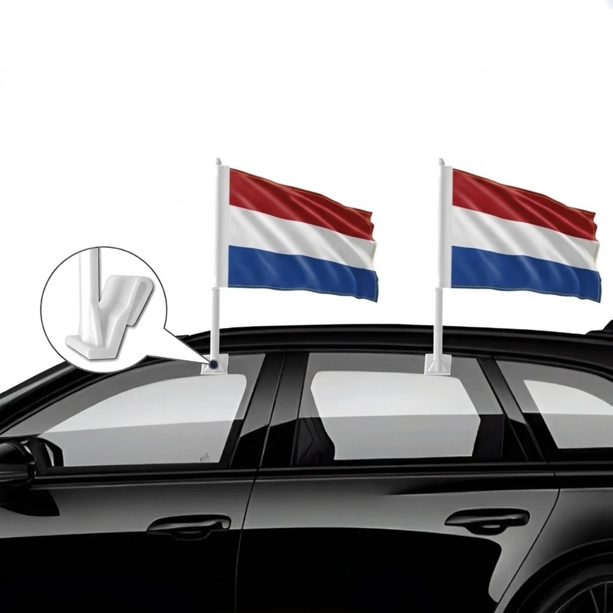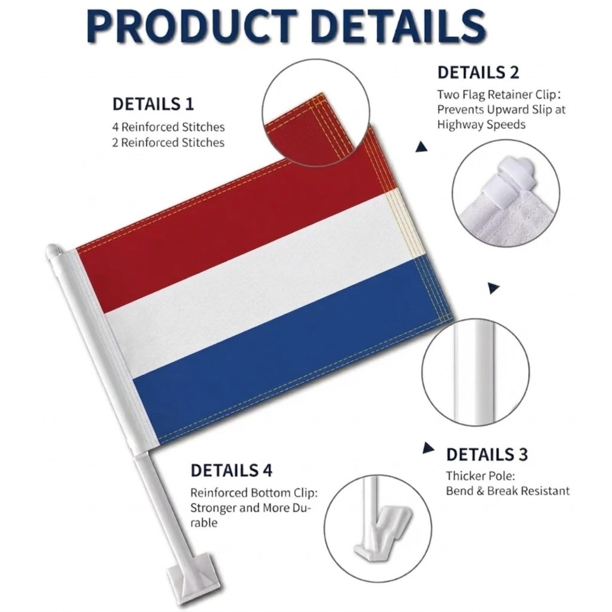 This set of two Official FIFA 2026 Netherlands Car Flag, sized 11 x 17 inches each, is designed for displaying national pride during daily driving, parades, sporting events, and patriotic celebrations. Made from two-layer warp-knit polyester, the fabric provides improved structure compared to standard lightweight materials. The double-sided printing ensures the red, white, and blue tricolor appears clear and correctly oriented from both directions. Built to handle road wind and changing weather conditions, the construction supports consistent outdoor display. A reinforced window clip system allows stable attachment without tools, making installation quick and convenient.