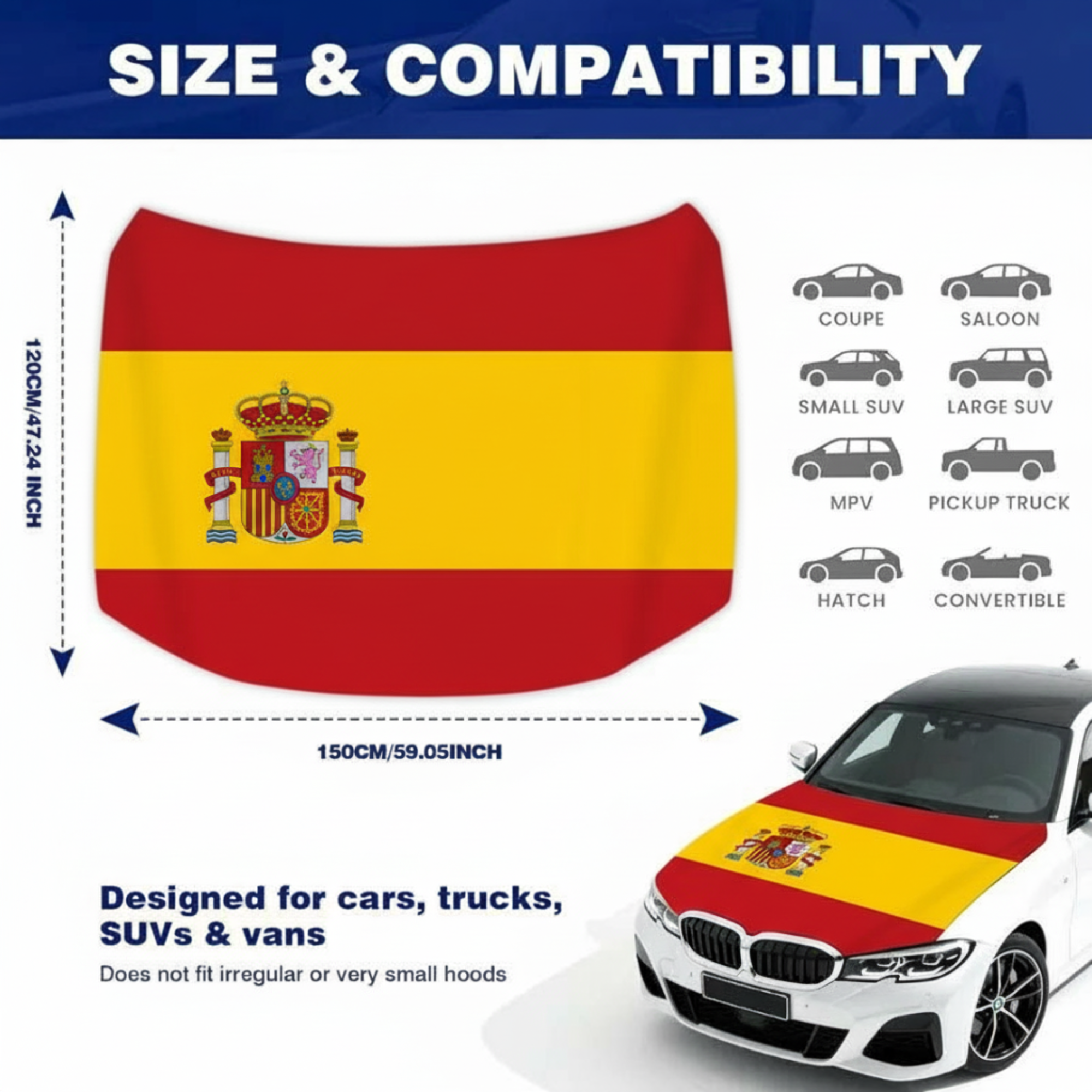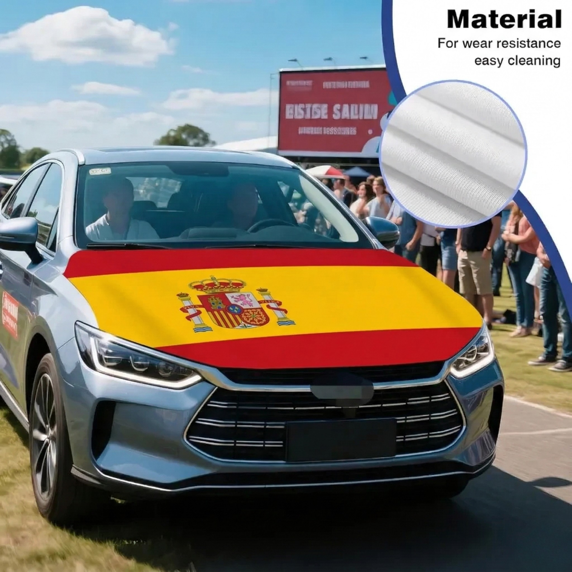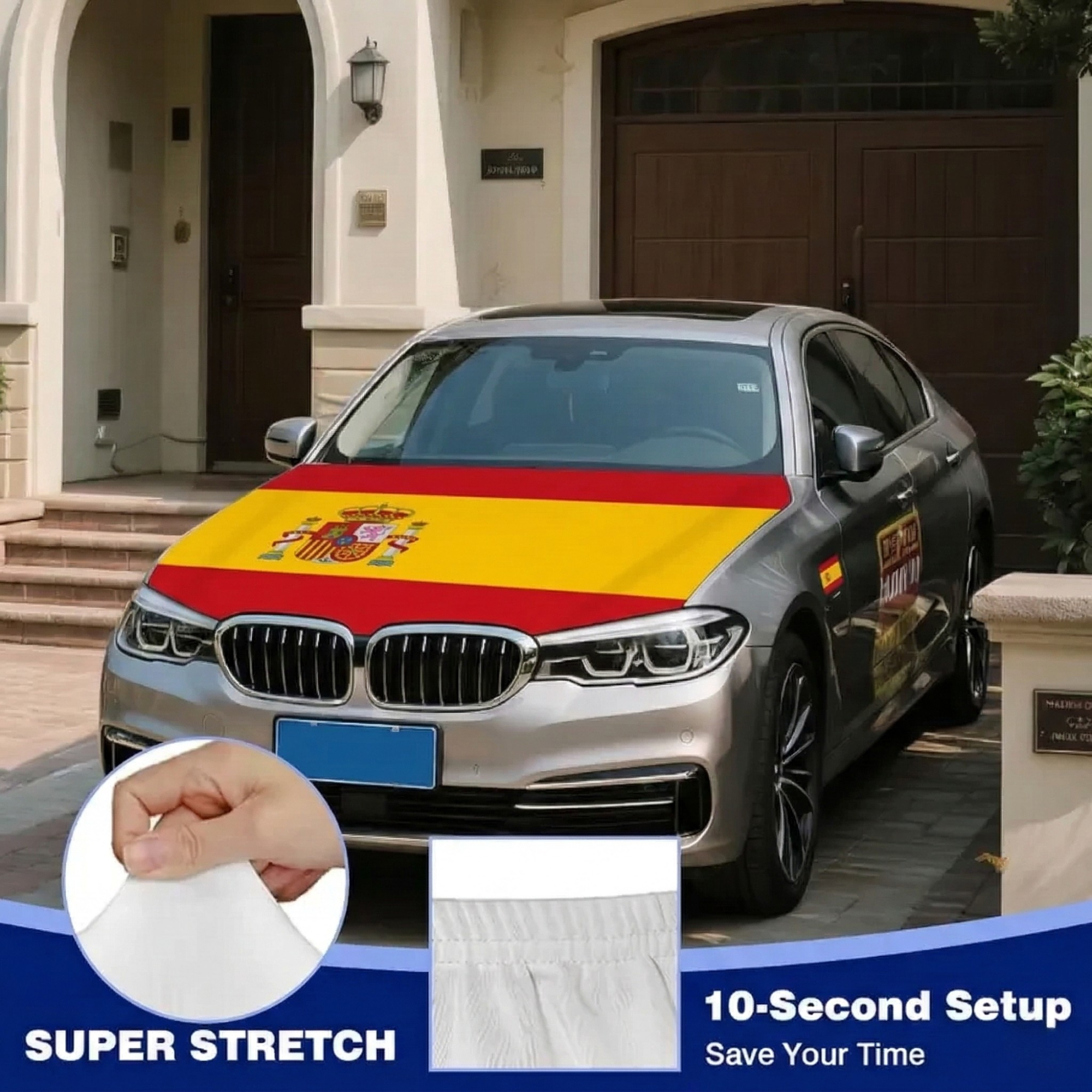 This Official FIFA 2026 Spain Flag Car Hood Cover is designed to display the national flag design across the vehicle hood while covering the surface during regular driving. Measuring approximately 4 × 5 feet, the cover provides a universal fit suitable for many cars, trucks, and SUVs. Made from stretch polyester fabric, the material adapts to the hood shape and helps maintain a smooth appearance during vehicle use. The printed design features the red and yellow horizontal bands with the central emblem commonly associated with the Spain national flag. The flexible structure allows quick placement and removal while maintaining a stable position during normal driving conditions.