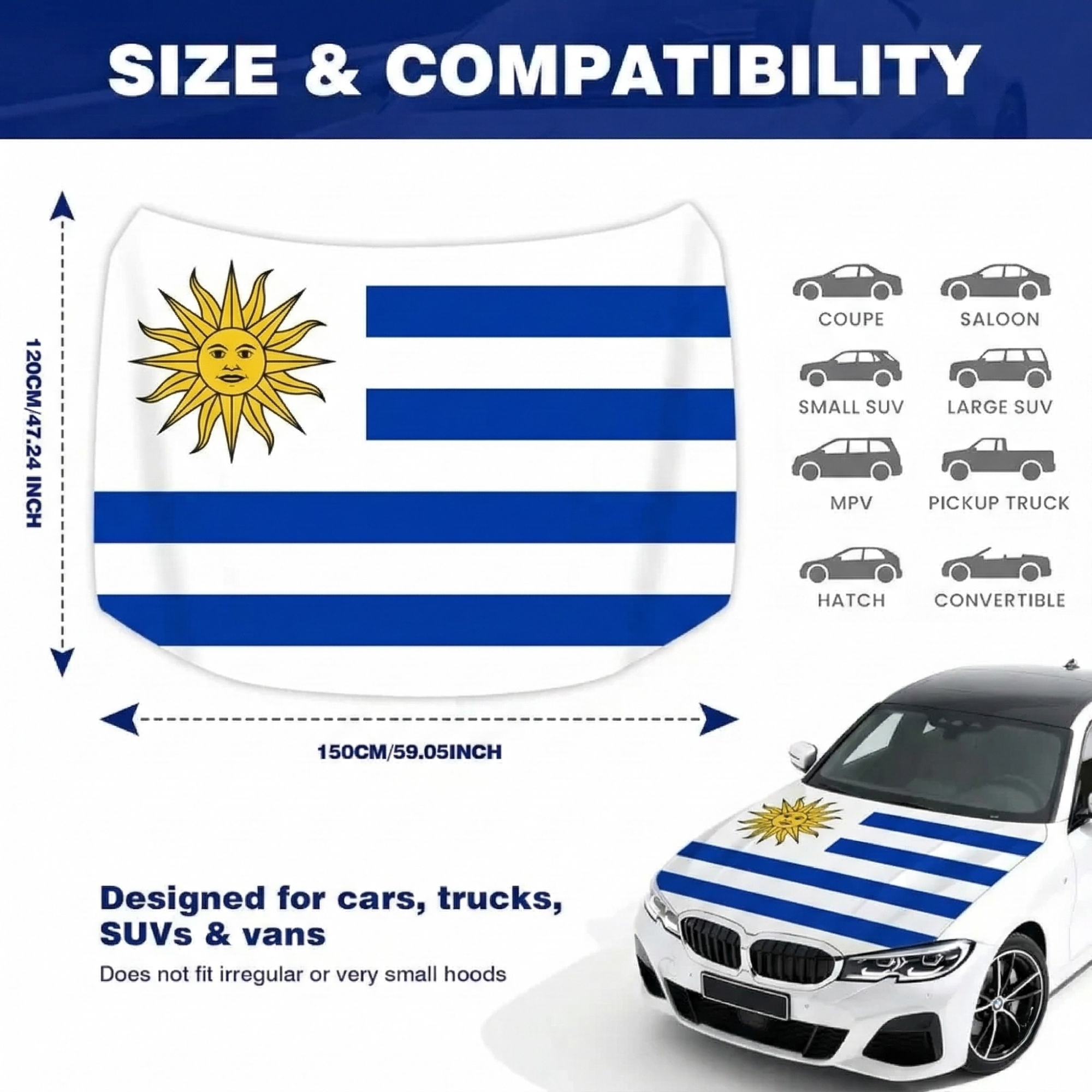 The Official FIFA 2026 Uruguay Flag Car Hood Cover is designed for decorative vehicle display during sporting gatherings, parades, and national celebrations. Measuring approximately 4 × 5 feet, the cover provides a universal size suitable for many cars, trucks, and SUVs.