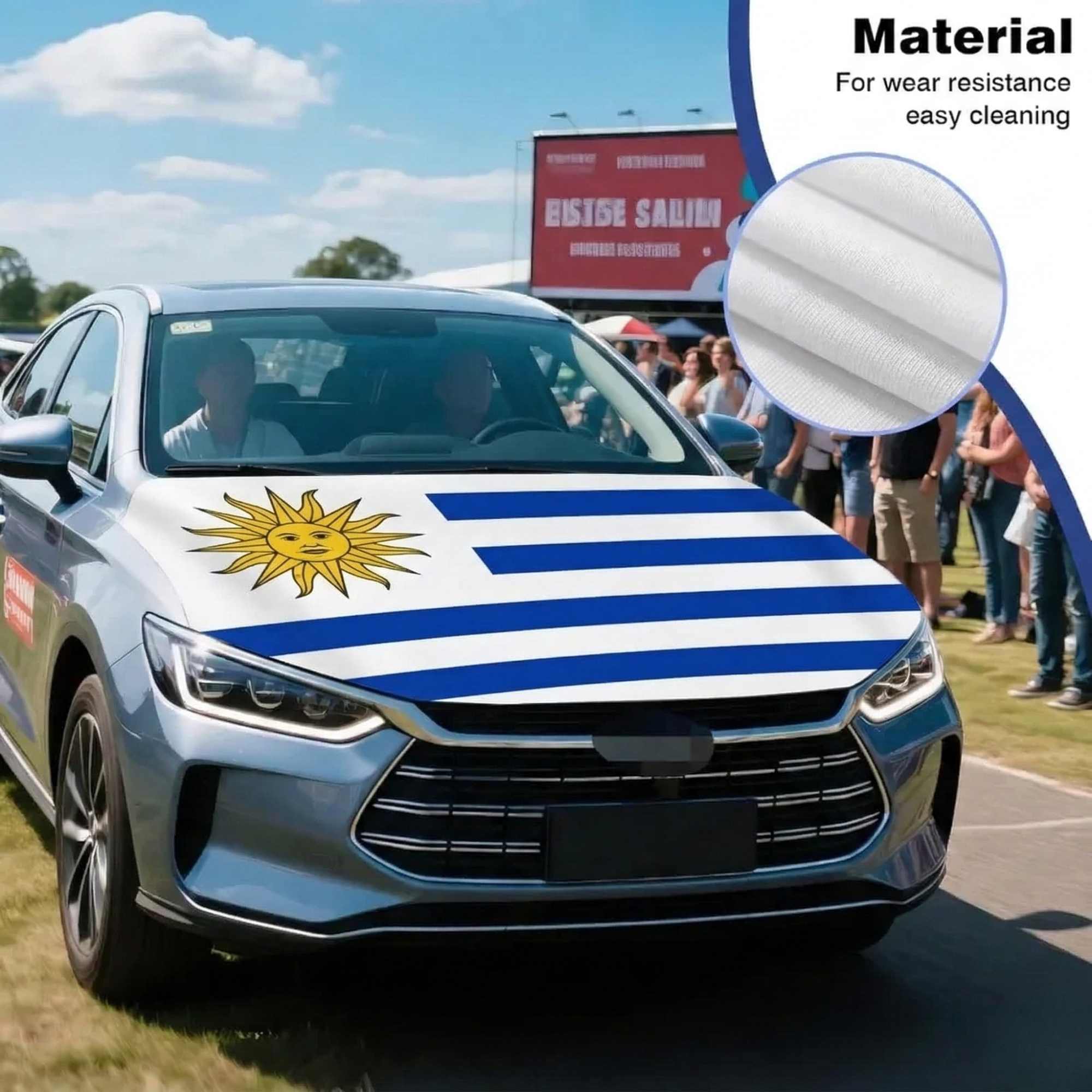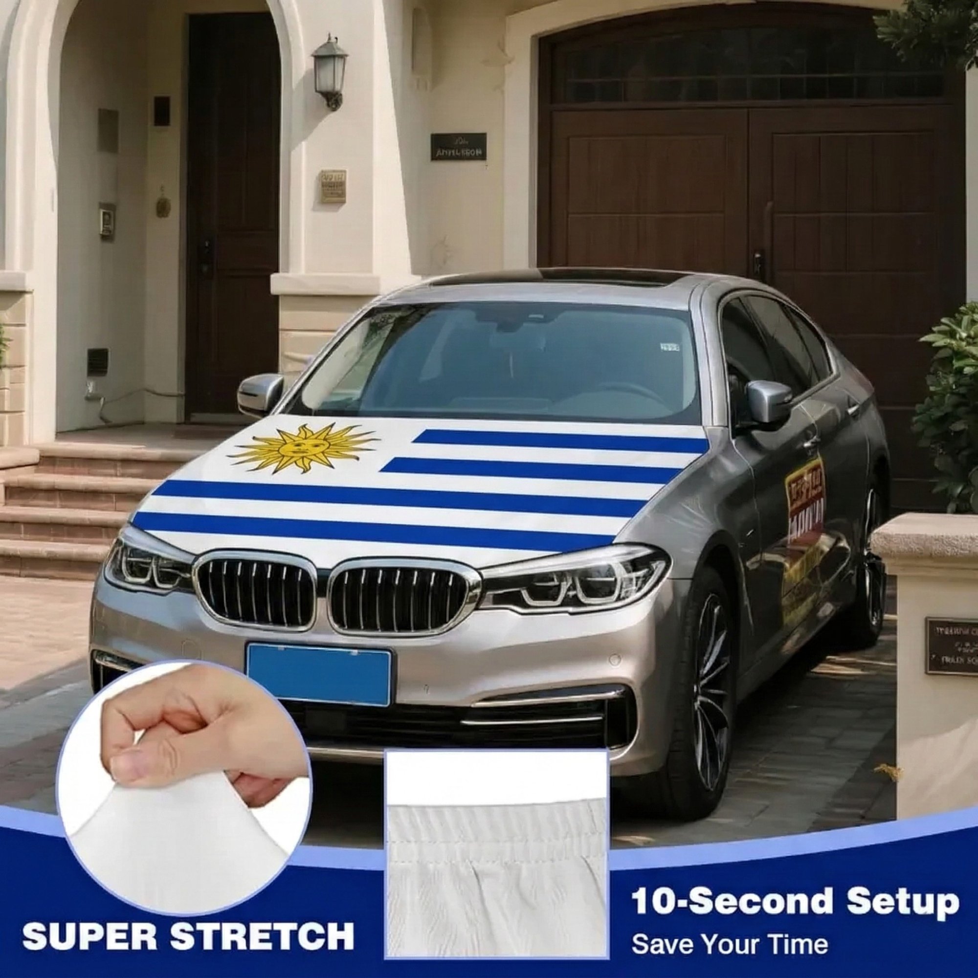 Made from stretch polyester fabric, the material fits over the hood area and adapts to the vehicle shape during regular driving. The Uruguay flag design appears clearly across the front section of the vehicle.