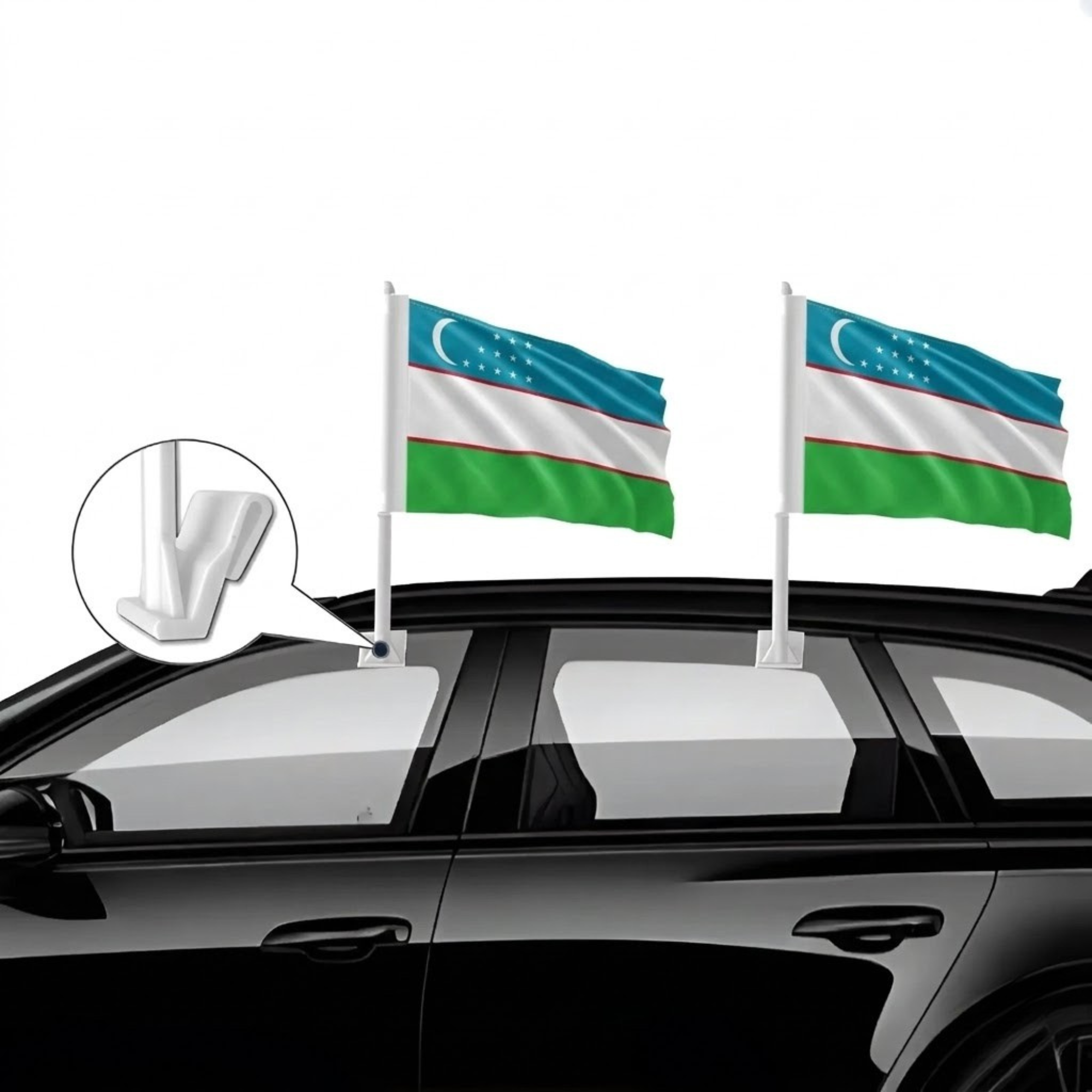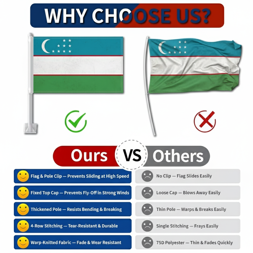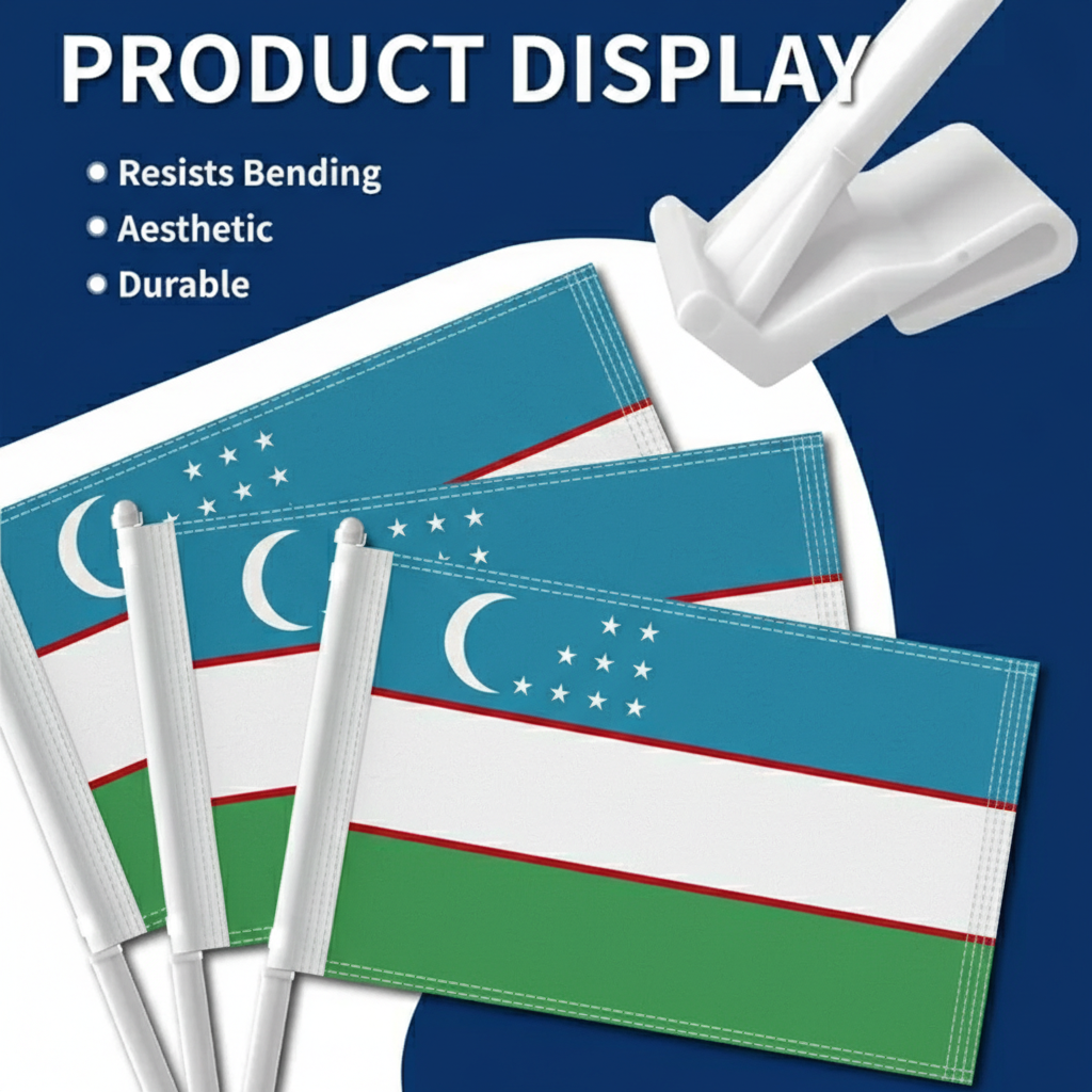 This set of two Official FIFA 2026 Uzbekistan Car Flag, each measuring 11 x 17 inches, is created for displaying national pride while driving during football tournaments, parades, sporting gatherings, and patriotic celebrations. Manufactured from two layer warp knit polyester fabric, the material provides stronger structure compared with many thin flag fabrics used for vehicle flags. The double sided printing allows the blue, white, and green stripes with the crescent and stars of the Uzbekistan national flag to appear clear and properly positioned from both viewing directions. Designed for vehicle presentation, the flag construction performs well in road wind and changing outdoor weather conditions. A reinforced window clip mounting system allows quick attachment to vehicle windows without the need for tools. The thicker support pole helps maintain an upright position while driving, supporting a balanced and tidy display. Suitable for cars, SUVs, and trucks, this flag set offers a practical display option for tournament celebrations and everyday vehicle decoration.