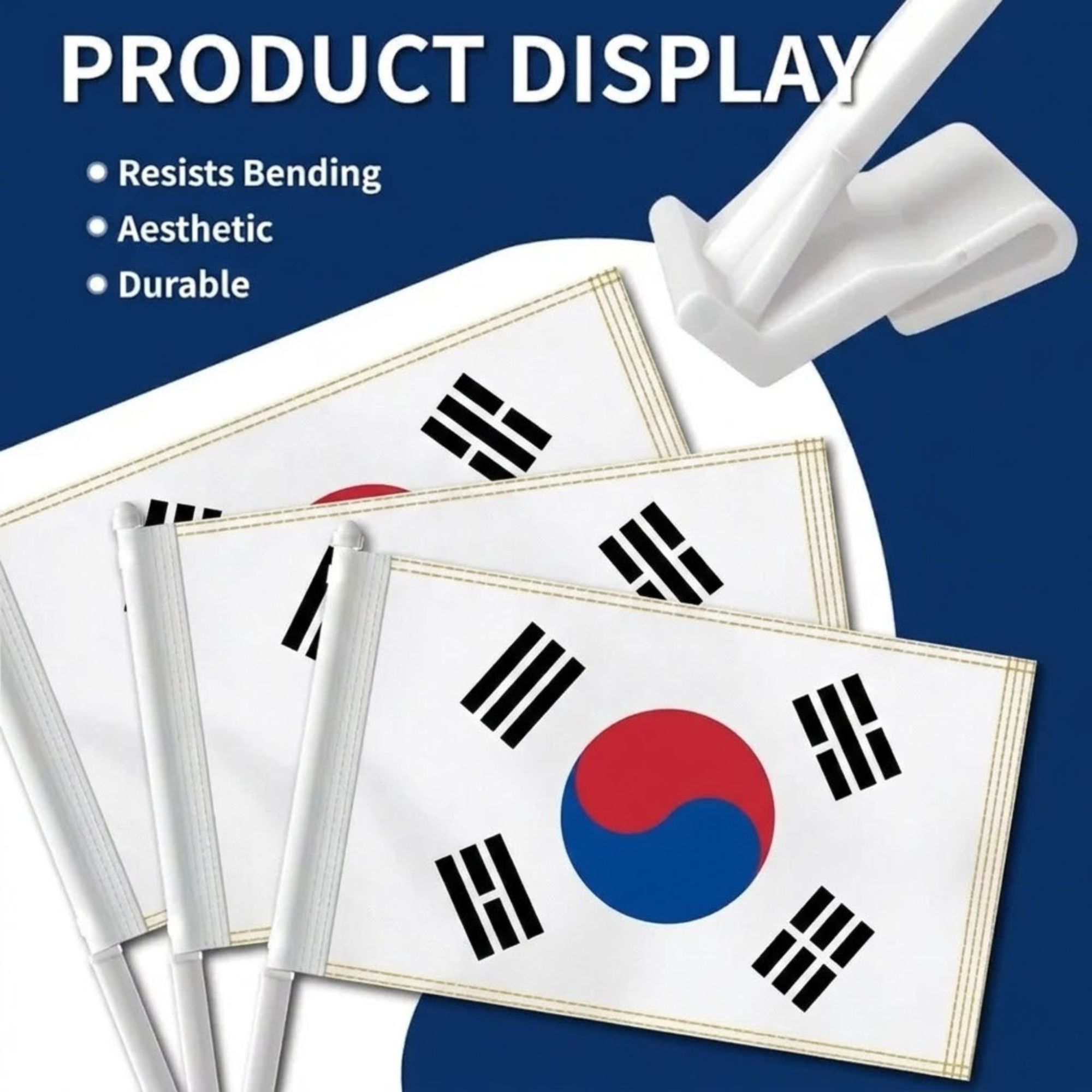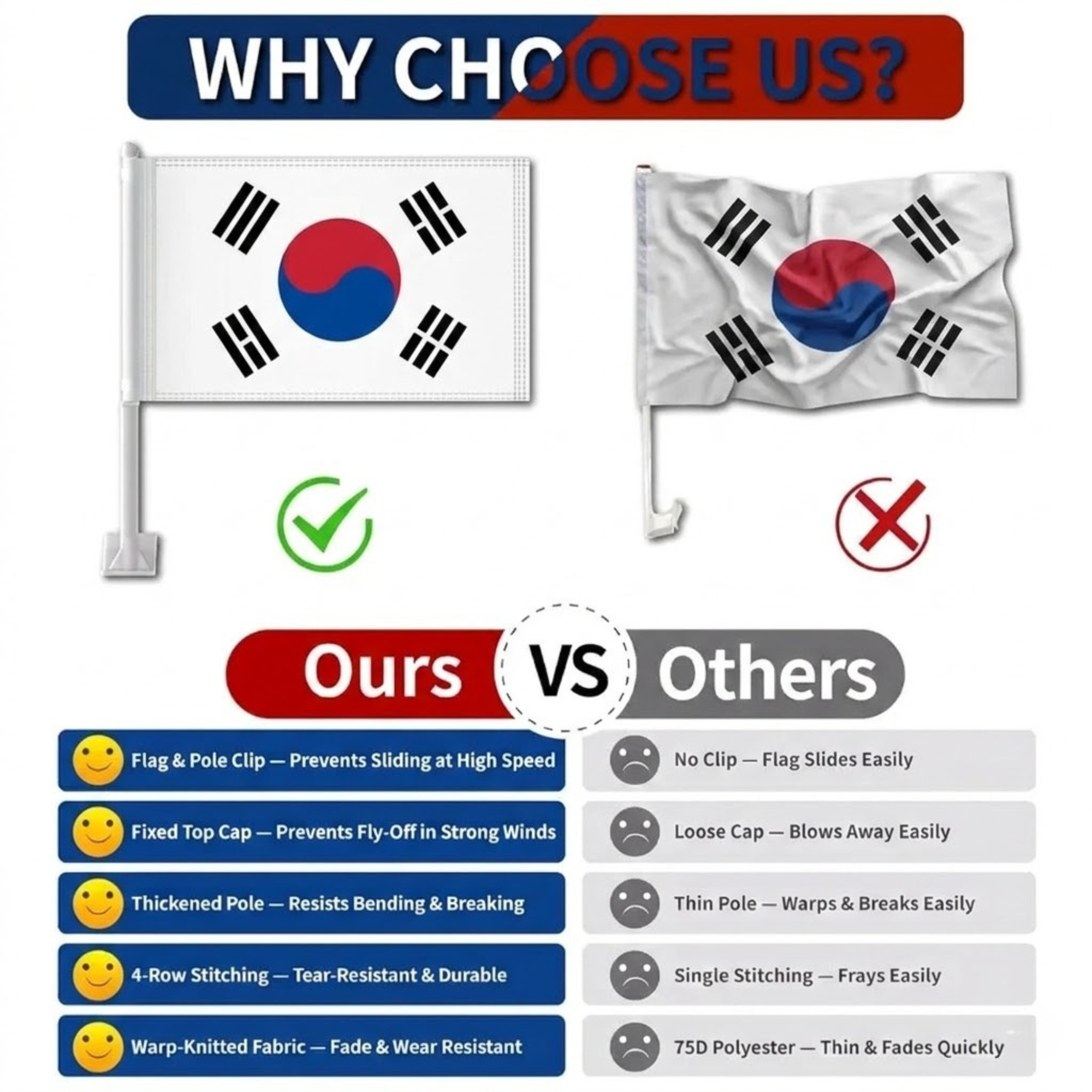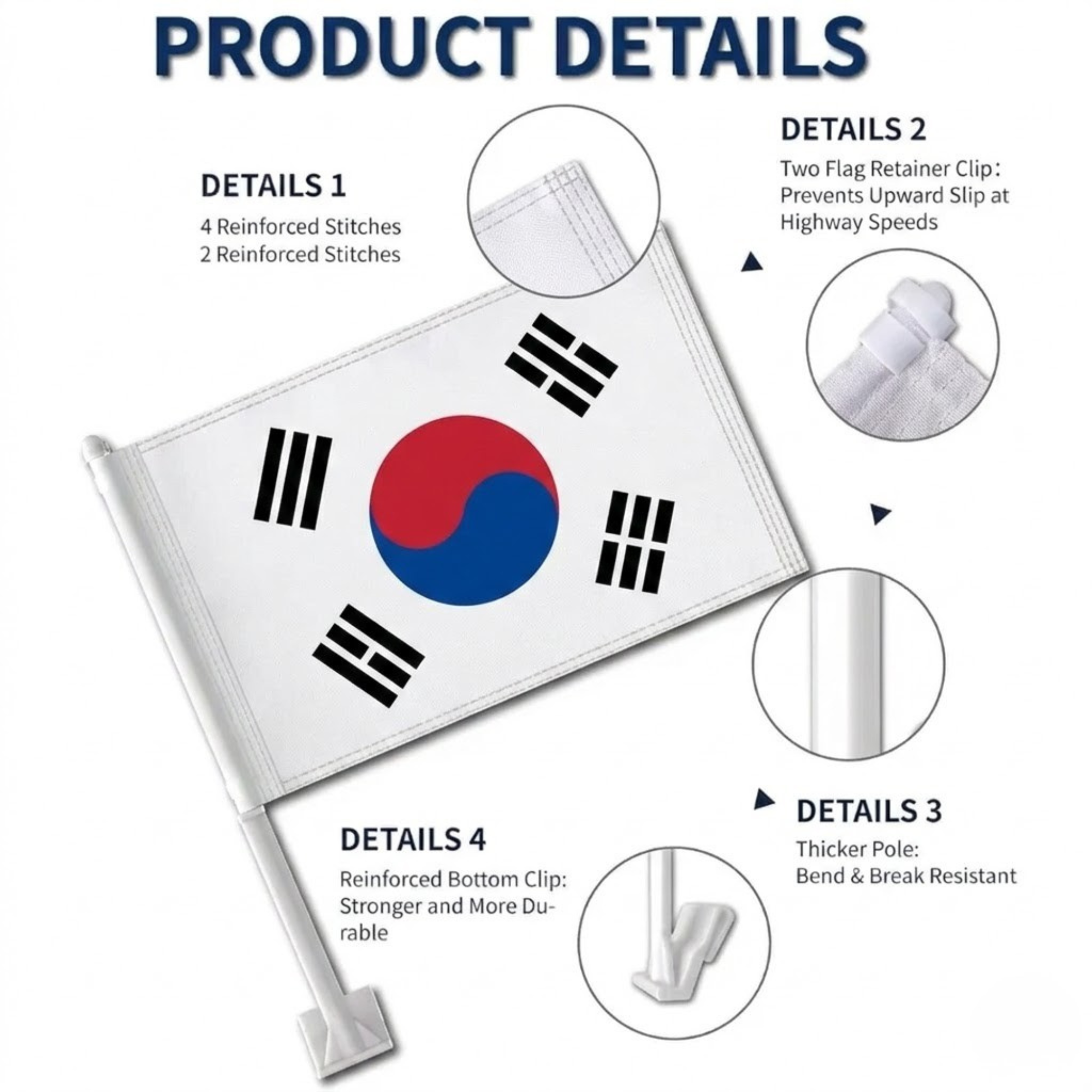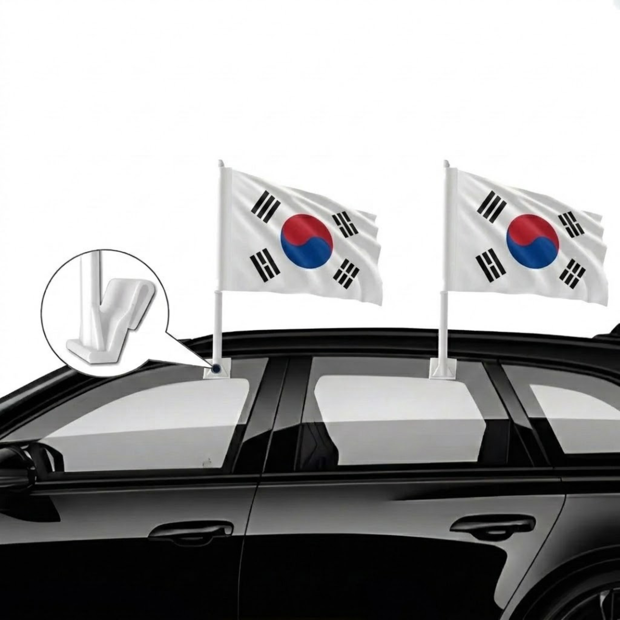 This Set Of 2 Official FIFA 2026 South Korea Car Flag, sized 11 x 17 inches each, is designed for displaying national pride while driving during tournaments, parades, sporting events, and patriotic celebrations. Made from two-layer warp-knit polyester, the fabric provides improved strength and structure compared with thin standard flag materials. The double-sided printing ensures the Taegeuk symbol and traditional colors of the South Korea flag appear clear and properly oriented from both directions. Built for road use, the construction supports performance in wind and changing outdoor weather conditions. A reinforced window clip mounting system allows convenient attachment to vehicle windows without requiring tools. The thicker support pole helps maintain stable positioning while driving, supporting a neat and balanced display. Suitable for cars, SUVs, and trucks, this flag set combines visibility and practical construction in a compact format appropriate for both special occasions and everyday vehicle decoration.